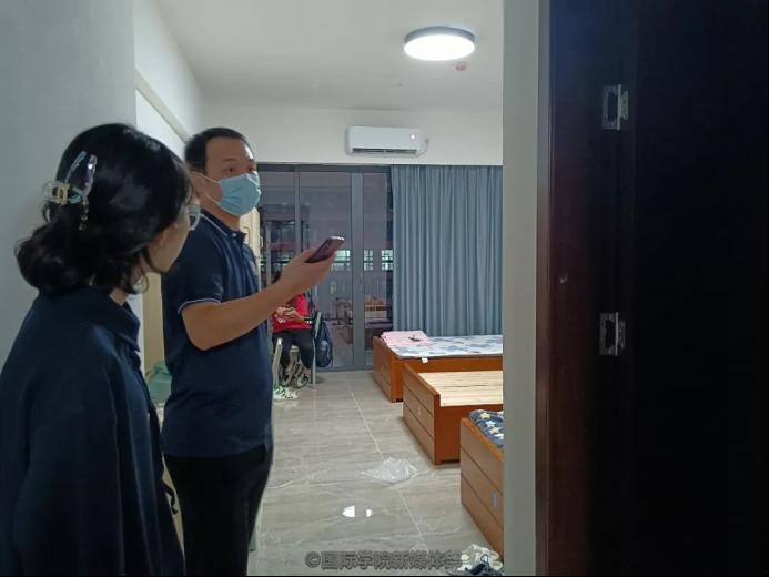 In the evening, the counsellor Yang Lijun and the staff Shen Xiaoting of the International School, visited freshmen dormitories, caring about the condition of their accommodation, and encouraging students to make good plans for better adapting to the campus life.