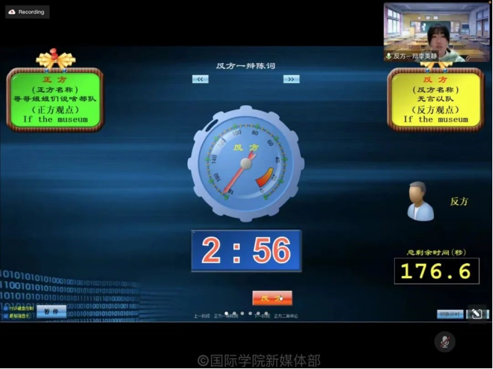 Four teams participated in the competition. Before each session, the moderator explained the rules of the debate and then announced its start. In the preliminary round, the topic focused on “Keyboard warrior is a warrior or not”. The pro side was required to give evidence to support “Keyboard warrior is a warrior”; and the con side gave the argument to prove “Keyboard warrior isn’t a warrior”. The debaters devoted themselves to the competition with fluent English and quick thinking, and provided an audio feast for audiences. After intense rounds, team one (contestants Chen Yanxi, Lin Zihan, Gong Yuxin and Yang Minzhan were included) and team four (contestants Li Meijing, Yan Jiarun, He Meixuan and Li Zining were included) won in the preliminary stage.