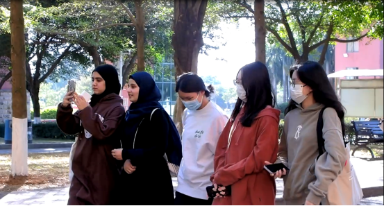 来华留学生们在校训石前合影留念后,徜徉在校园中,一边与华商学子交流,一边观赏校园的景色,并不时发出赞叹,对广东民办高校的蓬勃发展留下了深刻印象。