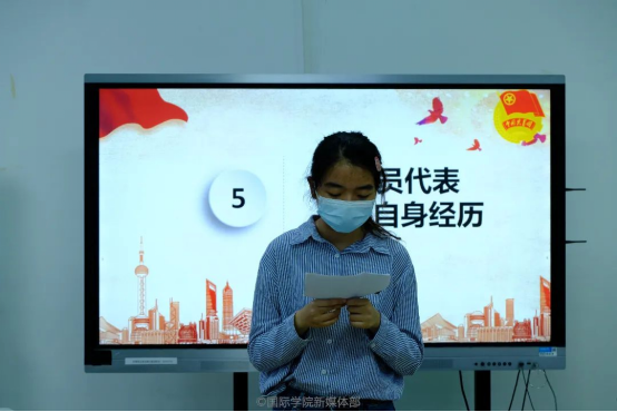 紧接着,来自22本国际经济与贸易(国际班)的宫钰馨进行分享。青春是美好的,但奋斗的青春才是最精彩的。宫钰馨同学指出,我们要力争成为新时代改革创新的排头兵,争做改革事业的拥护者、支持者和参与者。努力学习科学文化知识,培养创新精神和实践能力;同时我们可以积极参与学校或者社会组织的各项基层公益活动,在自身的工作中磨砺担当的肩膀、增长成事的本领。最后,宫钰馨同学希望同学们都能扬起风帆,在波涛汹涌的大海中不断前行,展现我们新一代的青春和力量!