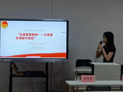 大会共有四项内容,奏唱团歌、观看志愿活动视频、三月份学雷锋志愿活动代表分享活动心得以及团委副书记总结发言。