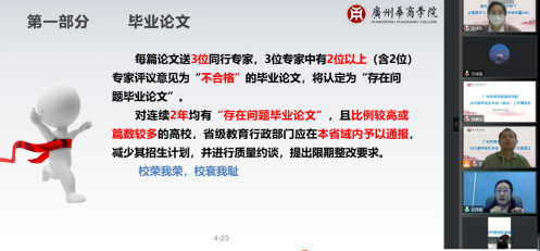 回雁雁院长结合教育部《本科毕业论文(设计)抽检办法(试行)》的通知教督〔2020〕5号以及学校教学工作会议精神,对毕业论文撰写提出了规范性要求,同时提醒毕业生要注重学术规范,如未来教育部抽查过程中发现问题,可能存在被取消学位证书的风险。