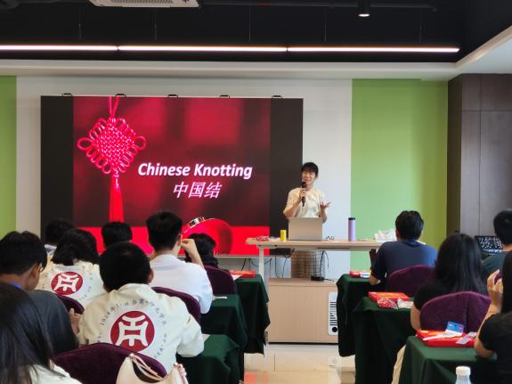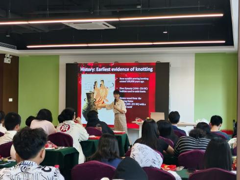 在《中国结:编织中的中华文化》课堂上,熊卫老师向学生们介绍了中国结的历史背景、象征意义以及丰富多样的款式,中国结是一种手工编织工艺品,它身上所显示的情致与智慧是汉族古老文明的一个侧面。在战国时代的青铜器上经常有中国结图案出现,可以代表汉族悠久的历史,符合中国传统装饰的习俗和审美,故命名中国结。中国结代表着团结幸福平安。通过讲授,学生们对中国结这一中华文化符号有了更深入的了解。在熊卫老师的耐心指导下,学生们在实践中感受到了编织中国结的乐趣,也更加贴近这一传统手工艺的文化内涵。