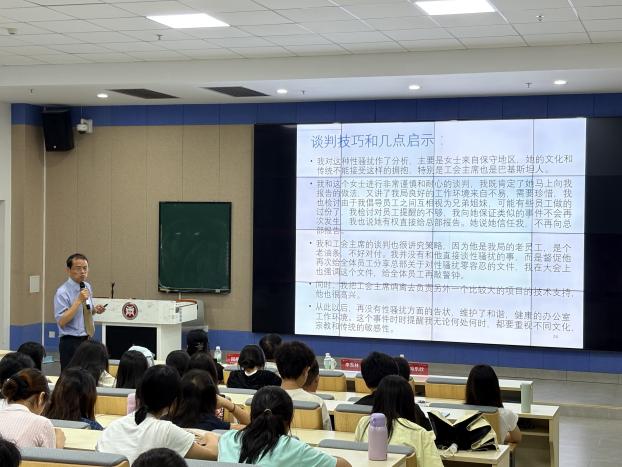 李东林局长以“国际谈判技巧和几个典型案例分析”为题,结合二十余年国际组织工作经历,以亲身经历的缅甸政变、斐济工会领袖获释、化解巴新雇员纠纷、处理巴基斯坦办公室性骚扰事等五个谈判案例,为在场师生剖析了国际谈判的核心要义与实战经验。他特别强调,国际组织亟需具备跨文化沟通能力、专业素养和全球视野的复合型人才,国际谈判是经常会面临的挑战,在国际谈判中需要认识到,文化理解力和尊重多样性是化解冲突的关键;灵活应变和调整谈判策略是成功的保障;熟悉国际规则与相关法律条款是开展谈判的基础。李东林局长尤其强调,谈判的理念应该是“通过双赢实现皆大欢喜”,不应是零和博弈。