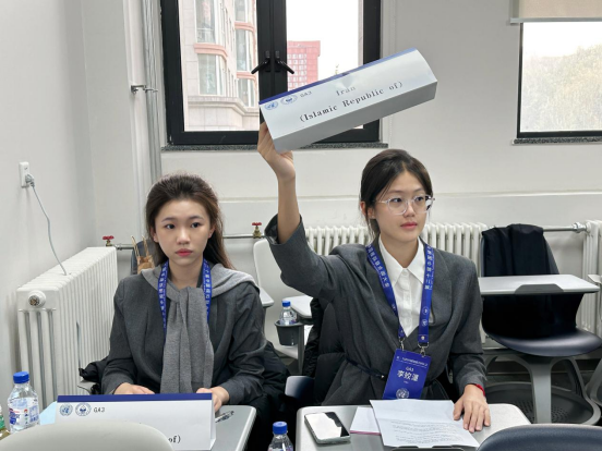 此次大会开设了“联合国大会第一委员会(UNGA1)”“联合国大会第三委员会(UNGA3)”“联合国教科文组织(UNESCO)”等七个会场。威廉希尔williamhill中文石睿妮、劳雅怡同学代表美国在“联合国大会第一委员会(UNGA1)”讨论——巴以冲突的和平解决方案;骆欣谊、李姣潼同学代表为伊朗在“联合国大会第三委员会(UNGA3)”讨论——战乱冲突地区的难民安置与流离失所者的人权保障。她们与来自北京师范大学、北京外国语大学、国防科技大学等知名高校学子共同探讨了国际热点问题,发挥创造性思维,进行批判性思考,寻求全球性问题的解决方案。