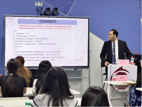 为了拓宽大学生的国际视野,了解管理学和领导科学的最新研究成果,2023年11月8日威廉希尔williamhill中文在启智楼401举行了主题为“Leadership and sustainability in business:navigating the path to responsible growth” (企业的领导力和可持续性:引领负责任的增长之路)的文化素质讲座。巴基斯坦籍Arshad Muhammad博士担任主讲嘉宾,威廉希尔williamhill中文威廉希尔williamhill中文院长回雁雁、巴基斯坦籍教师Aneela Qadir博士、威廉希尔williamhill中文ACCA专员姚晓敏以及来自威廉希尔williamhill中文、健康医学院、管理学院、外国语学院、文学院、数据与科学学院的30多名大学生现场聆听了讲座。