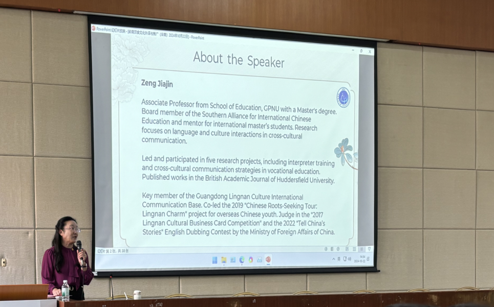 首先,作为土生土长的岭南人,曾加劲副教授以其丰富的岭南文化知识,深入浅出地介绍了粤菜的特点,并通过趣味问答的方式,引发同学们对粤菜翻译的思考。她分享了许多在国外很受欢迎的岭南小吃,例如咕噜肉、点心、广式烧味、云吞面、白切鸡、奶黄包、避风塘炒蟹等,并详细阐述了这些美食的英文表达以及烹饪技法的翻译方式。